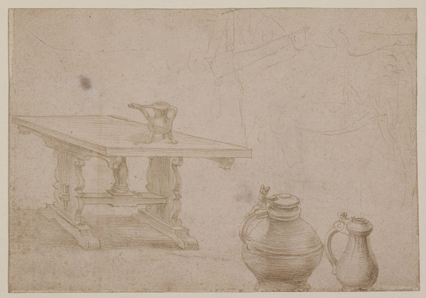 Albrecht Dürer (German, 1471 - 1528), A Table and Jugs with a Sketch of a Horse in Trappings (recto); A Chest and Firedog (verso), 1520/1521, silverpoint on pale pink prepared paper, 4 1/2 × 6 9/16 (11.5 × 16.7), On loan from The British Museum, London © The Trustees of the British Museum, London, 1921,0714.2.