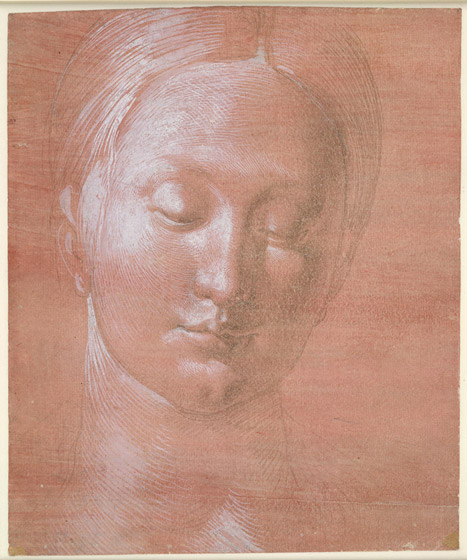 Albrecht Dürer (German, 1471 - 1528), Head of a Woman, c. 1505/1507, silverpoint with brush and gray wash (or traces of black chalk?), heightened with white over blind stylus underdrawing on pink prepared paper, 8 9/16 × 7 1/8 (21.8 × 18.1), On loan from The British Museum, London © The Trustees of the British Museum, London, 1895,0915.978.