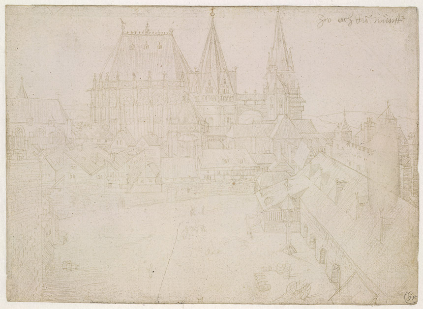 Albrecht Dürer (German, 1471 - 1528), The Cathedral at Aachen, 1520, silverpoint on pale pink prepared paper, 4 15/16 × 6 7/8 (12.6 × 17.4), On loan from The British Museum, London © The Trustees of the British Museum, London, 1895,0915.982.