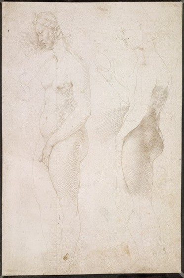 Circle of the Wierix Brothers, Two Studies of a Standing Nude Woman in Profile to the Left, Holding a Mirror, c. 1580, silverpoint over blind stylus, strengthened with pen and ink, on prepared paper, On loan from The British Museum, London © The Trustees of the British Museum, London, 1895,0915.979.