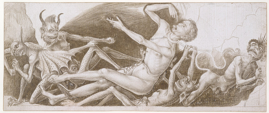 Circle of Rogier van der Weyden, Dives Tormented by Demons in Hell, c. 1450/1470, silverpoint with scratching on cream prepared paper, 4 9/16 × 11 (11.6 × 27.9), On loan from The British Museum, London © The Trustees of the British Museum, London, 1884,0726.29.