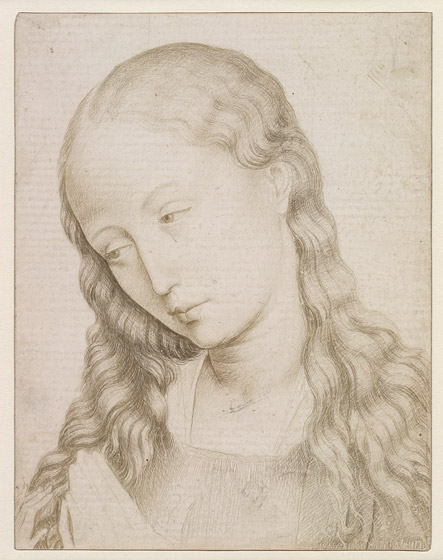 Circle of Rogier van der Weyden, Head of the Virgin, c. 1450/1470?, silverpoint with scratching on white prepared paper, 5 1/16 × 3 15/16 (12.9 × 10), On loan from The British Museum, London © The Trustees of the British Museum, London, 1884, 0726.27.
