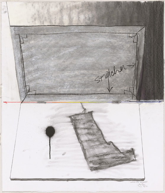 Fragment—According to What: Hinged Canvas, 1971, lithograph, working proof with crayon, chalk, and graphite, National Gallery of Art, Washington, Patrons' Permanent Fund and Special Friends of the National Gallery of Art. Art © Jasper Johns/Licensed by VAGA, New York, NY. 2006.136.40