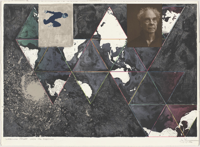 Ocean is the title of a 90-minute dance choreographed by Merce Cunningham and first performed by his dance company in 1994. This is one of three working proofs Johns made while developing a lithographic edition of Ocean to benefit the company founded by Cunningham, who is represented in the two portraits. The geometric structure recalls that of Johns' painting Map (Based on Buckminster Fuller's Dymaxion Air Ocean World) of 1967–1971. The implied 19-triangle format echoes the 19-part structure of Cunningham's dance.