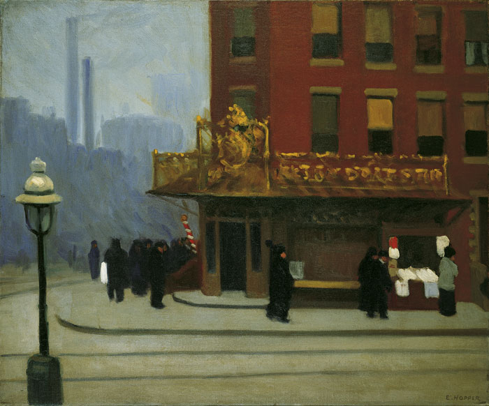 Although Hopper regularly visited New England, Greenwich Village (where he lived in the same apartment from 1913 until his death in 1967) was home, and New York set the stage for many of his most iconic paintings. Just as he in New England shunned dominant artistic motifs, Hopper disregarded many Jazz Age subjects—soaring skyscrapers, bustling streets, and industrial machinery—favored by American modernists. Indeed, Hopper's New York is at once instantly recognizable and strangely unfamiliar: streets are devoid of pedestrians, stores are without customers, and even automats—modern restaurants in which coin-operated, food-dispensing machines replaced waiters—lack signs of anything automatic. And though New York architecture rose to great new heights, Hopper favored instead a horizontal compositional format more closely linked to landscape traditions. He also avoided signs of the grit, noise, and commotion of urban life, imbuing his portrayals of the city with an overwhelming silence and disquieting stillness.