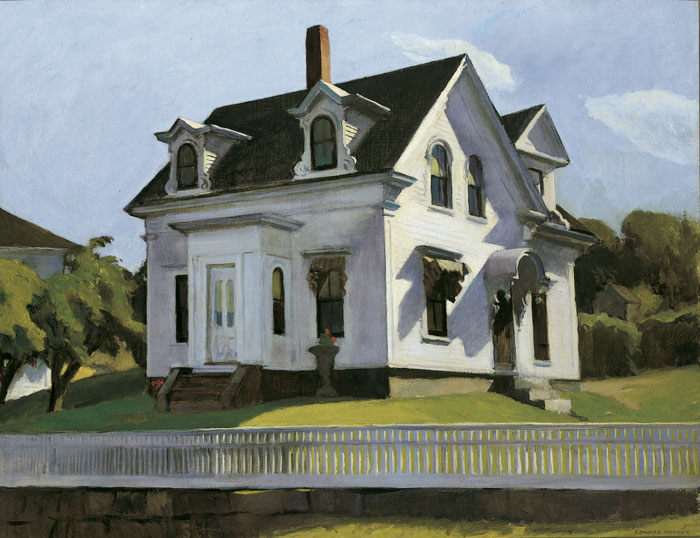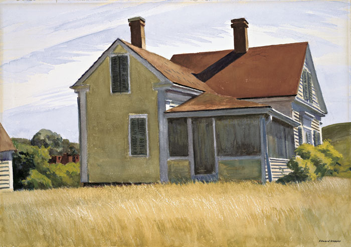 Throughout his career, New England—first Gloucester, later Maine, and finally Cape Cod—was the source for much of Hopper's subject matter. These coastal communities were popular destinations for artists, but the independent-minded Hopper remained distant from his colleagues, dryly noting, "[W]hen everyone else would be painting ships and the waterfront, I'd just go around looking at houses." He had a penchant for architectural styles of past centuries, especially the Victorian with its heavy ornamentation and mansard roofs. He rendered these houses with dramatic light and often in isolation. Along the coast of Maine, where Hopper visited in the late 1920s, he painted lighthouses, solitary beacons amid the landscape. Full of intrigue and mystery, Hopper's lighthouses surpass their utilitarianism and assume a commanding presence—no longer mere incidental structures like those in the seascapes of other artists.