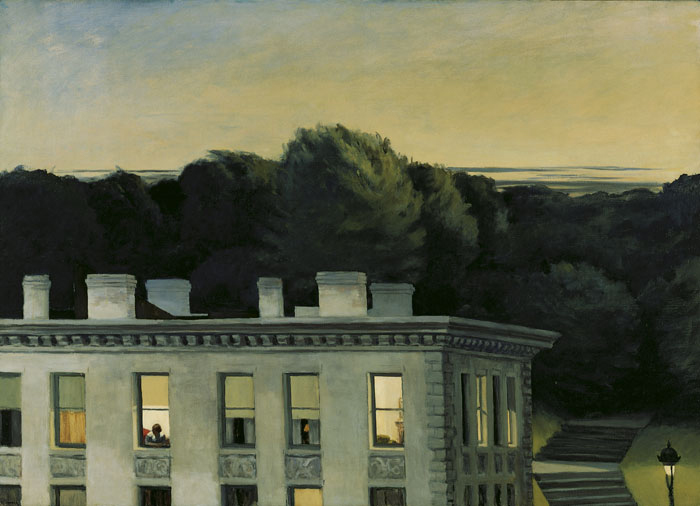 Throughout his career, Hopper was fascinated by dramatic lighting and nowhere is this more evident than in his nighttime pictures, where brightly lit interiors contrast with the darkness outside. Glowing fluorescent or electrical lights, which illuminate windows and spill onto otherwise darkened street, set the tone for many of Hopper's paintings and imbue the works with an air of mystery. The voyeuristic possibilities inherent in the modern city, where people lived in close proximity but often with anonymity—are especially apparent at night. Hopper frequently depicted stolen glances from fast-moving elevated trains and glimpses from windows into neighboring buildings, where figures are busy with their own private concerns, unaware or unconcerned that they are being watched.