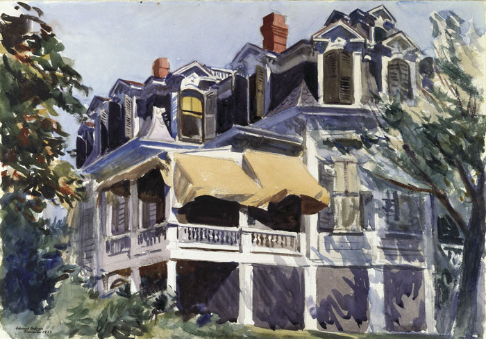 Although Hopper's etchings are primarily drawn from urban subjects, he chose watercolor to depict his early small-town or rural images. Encouraged by his fellow art student and future wife Josephine (Jo) Nivison, Hopper began using watercolor in earnest when summering in Gloucester, Massachusetts, in the early 1920s. The portability of the medium allowed Hopper to paint outdoors, where he favored local architecture to the picturesque coastal scenes that had made the region a popular artists' colony. His depictions of New England garnered Hopper important recognition: in 1923 his first sale to a public institution (the Brooklyn Museum's purchase of The Mansard Roof) and in 1924 a solo exhibition at Frank Rehn's Fifth Avenue gallery that sold out quickly. Critics admired his deft handling of the medium, straightforward style, and ability to transform vernacular architecture into something beautiful.