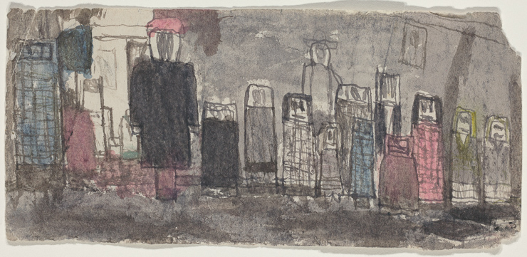 James Castle, Untitled (Figures Lined Against a Wall), n.d., color wash and soot on found paper, Gift of James Castle Collection and Archive, and Acquisition with Pepita Milmore Memorial Fund, 2013.33.33