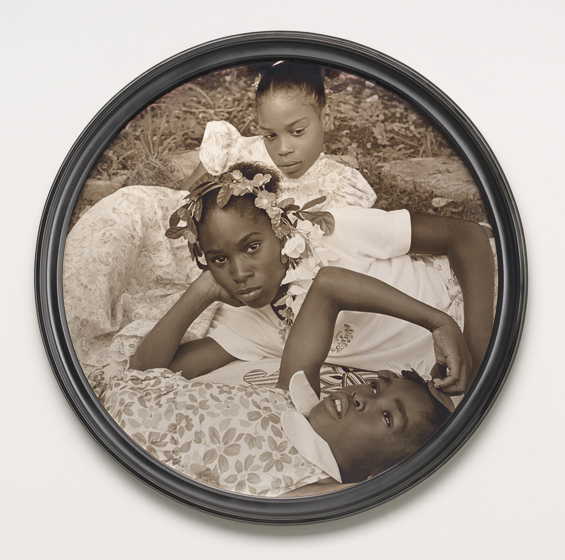 Weems has given a nod to the spring celebration by photographing girls dressed in flowers posing outside. She has also used a circular frame to hearken back to the Renaissance, when this format was utilized for images of the Christian Madonna and child. However, instead of showing a mother and child, Weems chose to depict African American girls, one of whom stares out at the viewer.