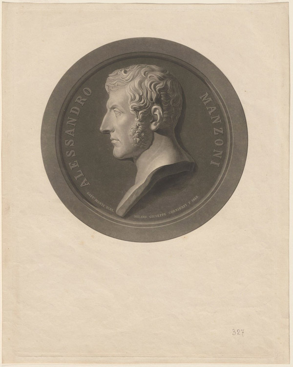Alessandro Manzoni is generally regarded as the greatest Italian author of the nineteenth century and his principal work, the novel The Betrothed (1827), is a cornerstone of the modern Italian language. Even before its publication Manzoni had achieved fame with The Fifth of May, a lyrical poem composed upon the death of Napoleon in 1821. Its success was the inspiration for the sculptor Gaetano Monti’s marble relief portraying the author in the idealized neoclassical style made fashionable during Napoleon’s annexation of Italy (1805–1814). A quarter century later, Cornienti, an academic engraver, translated Monti’s portrait into this, his best known print.