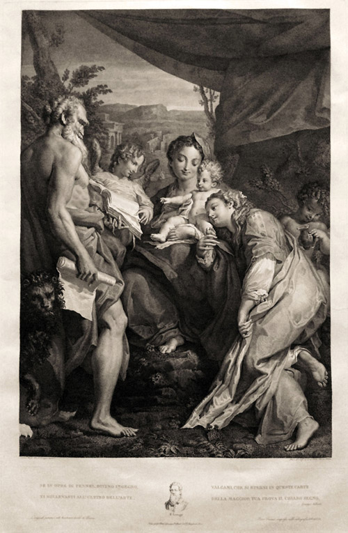 Correggio painted the so-called Madonna of Saint Jerome in the late 1520s for the church of Sant’Antonio, Parma. Ardently admired through the first half of the nineteenth century, it was engraved dozens of times. This print is usually judged to be the most successful at conveying the painting’s subtle tones, suffused atmosphere, and gentle sentiment. Gandolfi, the last figure in an important family of Bolognese artists, undertook this version at the behest of Giuseppe Vallardi, a leading dealer and collector in Milan who also composed the accompanying verse.