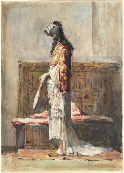 Fortuny’s visit to Morocco in 1860 inspired his fondness for exotic subjects, such as this Moroccan woman and the adjacent etching of a dead Algerian. The striking palette, remarkably varied textures of materials, loosely applied pigment, and freedom of handling exemplify the qualities that Fortuny’s contemporaries greatly admired in his work. Spanish born, Fortuny traveled incessantly but spent much of his last decade in Rome. His etchings, all made in this late period, inspired a generation of Italian printmakers to take up the technique and echo his style.