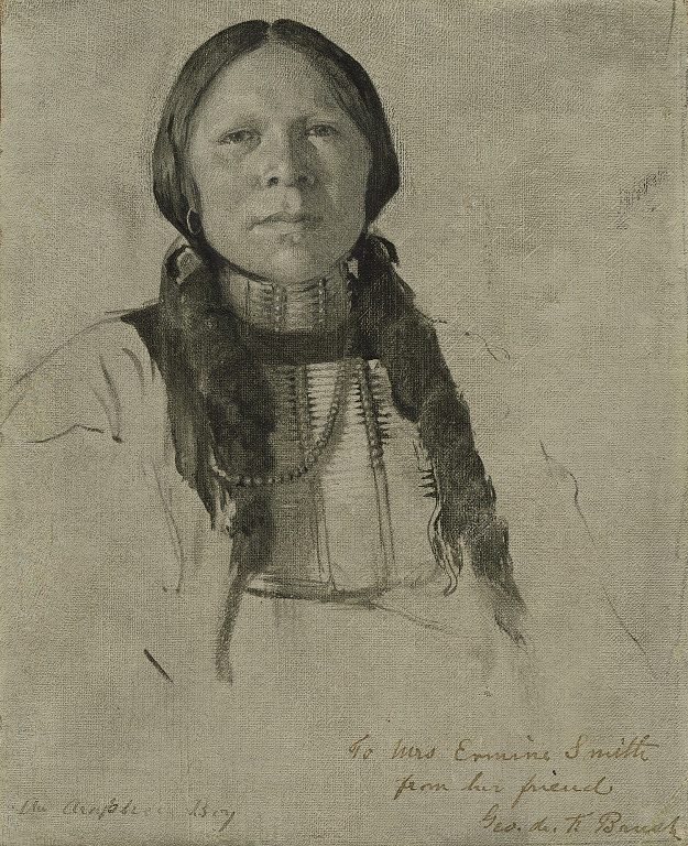 For more than a year, starting in 1882, George de Forest Brush (1854/1855–1941) lived among the Arapahoe and Shoshone in Wyoming and the Crow in Montana. He began to compose and exhibit studio paintings based on his experiences, declaring, however, that he did not wish to be an ethnographer or historian of Indian people. Painting during a period bracketed by the Battle of the Little Big Horn (1876) and the massacre at Wounded Knee (1890), the artists created stylized images of Indians far removed from the reality of contemporary Indian life. Instead, Brush’s “Indian” paintings are unmistakably personal. Increasingly disturbed by the rapid industrialization and mechanization of American society, Brush offered, in his art, the perfect foil–a seductively beautiful, pre-industrial world where idealized Indians live in a timeless environment undisturbed by the advent of the modern.