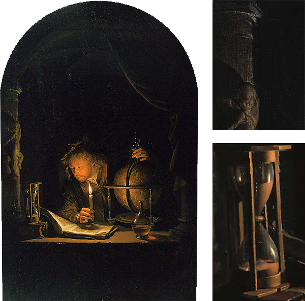 The hourglass at the figure's left, like the compass, was a common attribute of both geometry and astronomy. In addition, it serves as a reminder to make good use of time. Here the emphasis is on the assiduousness of the astronomer, who is hard at work late into the night.