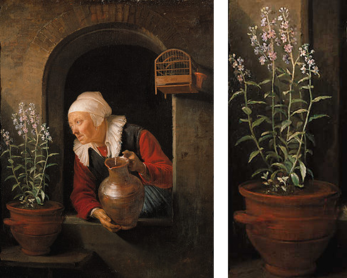 Dou uses a compositional arch as a functional window in this painting, with an old woman leaning out to water a pot of flowers placed on a bench just under the sill. The theme is rare in seventeenth-century Dutch painting prior to Dou's treatment; the many copies and versions of Dou's composition attest to its subsequent popularity.