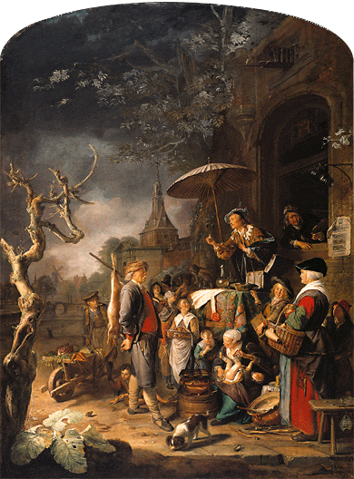 This painting depicts a quack -- a medical charlatan -- hawking his wares to a small crowd on the outskirts of Leiden. Among the onlookers are an elderly woman at the right whose pocket is being picked, a hunter who carries a dead hare hanging from his rifle barrel, a young woman who offers a coin to the quack while her companion peers at her décolleté, and a woman making pancakes who wipes a baby's bottom. A painter portrayed in the window behind the quack suggests that Dou sought to make a comparison between the two men. Both are masters of deception, yet the quack's wares have no value, while the painter's creations edify the mind and please the eye.