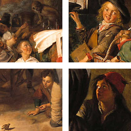 The onlookers clearly occupy a social stratum below that of the painter and his patrons. Their activities have both comic and disturbing overtones: a pickpocket takes advantage of an older woman's inattention; a schoolboy neglects his studies; several children look up at a monkey on the table; and a young boy lures a bird in an action that mimics that of the quack.