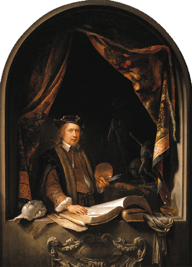 In this self-portrait, Dou depicts himself in an artist's studio holding a palette and brushes and studying a large open book. He is no ordinary craftsman, but an artist whose intellectual works are the means by which he will triumph over his own mortality. The painting's illusionism is enhanced by the objects on the window ledge -- the plaster cast, the book, the sash -- that seem to project into the viewer's space. The emphasis on Dou's artistry is intended both to delight and to prompt speculation about the relationship between the real and the represented worlds.