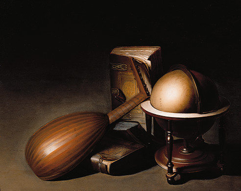 Gerrit Dou, Still Life with Globe, Lute, and Books, c. 1635, oil on panel, 22.5 x 30 (8 7/8 x 11 3/4), Mr. and Mrs. Michal Hornstein