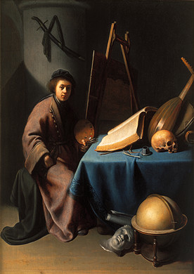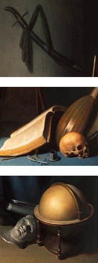 Dou's composition is filled with objects, some simply studio props. However, many of the objects depicted -- the globe, the plaster cast, the skull, the lute, the books, the sword -- were traditionally associated with the idea of vanitas, the ephemerality of life. Dou may have included these symbols of transience within his composition to contrast with the artist's achievements, which are lasting.