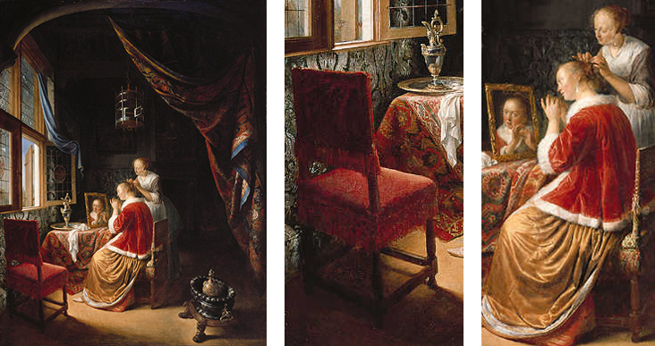 Dou's painting presents the typical "upper-class" subject of a woman primping before a mirror as her maid dresses her hair. The refined surroundings, which reflect the influence of Vermeer, Gerard ter Borch, and Frans van Mieris, include a luxurious tapestry curtain, a richly upholstered chair on which the woman sits, tooled leather wall hangings, an elaborate ewer and basin, a marble wine jug and footed cooler.