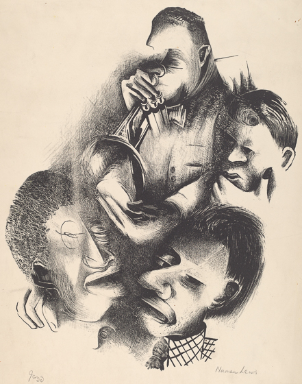 Lewis was influenced by the writings of Alain Locke, an intellectual, impresario, and leader of the Harlem Renaissance who advocated for black visual artists to explore the distinctive character of their experience and culture. Jazz is a hybrid art form with many influences, including West African music. In 1935, Lewis viewed African Negro Art, an early American exhibition (at the Museum of Modern Art, New York) of African sculpture, textiles, and objects shown as aesthetic works of art rather than ethnographic artifacts. Lewis then began a phase of drawing imagined African masks (see the associated Pinterest board for an example). The masklike appearance of the figures in this work may also have been influenced by the exhibition.