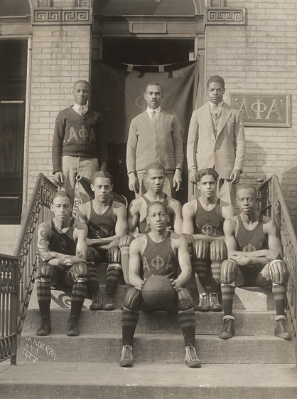 This portrait of a college basketball team shows a serious group of young men united by their affiliation with their fraternity and its basketball team. Alpha Phi Alpha was the first intercollegiate African American fraternity in the United States, its first chapter founded in 1906 at Cornell University in Ithaca, New York. The fraternity provided support, study groups, and, later, opportunities to participate in intercollegiate sports at a time when black players were not permitted on college teams. Note how each player is carefully posed and forms a symmetrical arrangement on the steps of the fraternity, showing their integrity as a group while radiating their determination to succeed in a racially divided country.