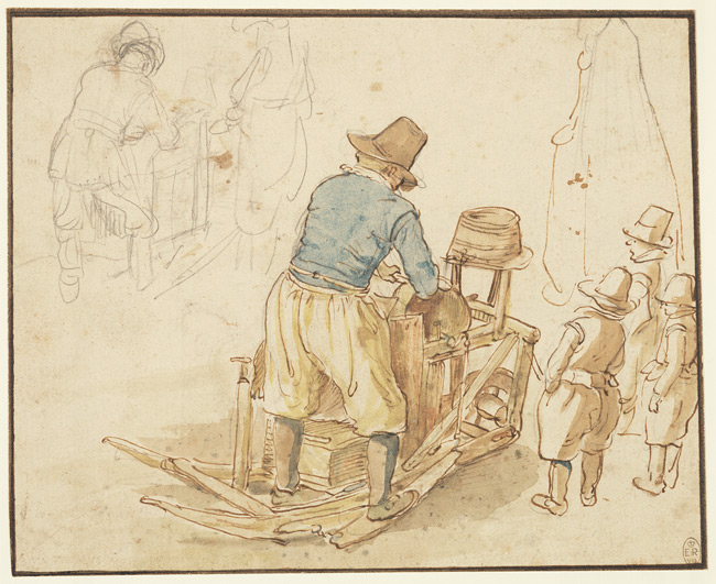Avercamp must have drawn often from life, although surviving examples of such drawings are rare today. One may well be the light sketch in the upper left corner of this sheet. After quickly drafting it, Avercamp reworked the scene, using watercolor to give body and shape to the figure of the craftsman and adding three little boys who are mesmerized by his task.