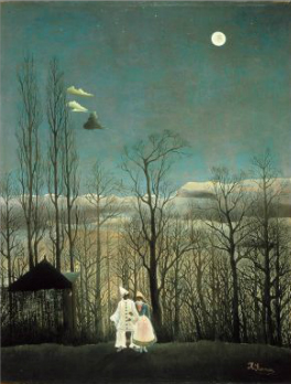 These first submissions elicited mockery and sarcasm from critics and the public alike, who were baffled by his strangely theatrical images of people—sometimes in elaborate costumes—inexplicably situated in an enveloping forest. Equally perplexing was his disregard for perspective, with foreground, background, and middle ground seeming to coexist on a single plane, like backdrops on a stage. Tinged with both enchantment and menace, these early works foreshadowed his jungle paintings. As one critic wrote, Rousseau's forest is "the virgin forest with its terrors and its beauties, that we dream of as children...[it is] the virgin forest as a creation of fantasy."