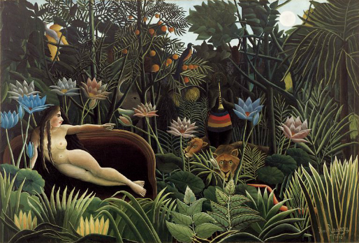 The Dream, which depicts a nude woman lounging on a divan in the middle of the jungle, represents the pinnacle of Rousseau's achievement. With this work the artist brought together the studio (the sofa is modeled after the one in his own studio) and the jungle, the domestic and the exotic, and earned the respect of the avant-garde artists. They may also have admired the allover precision of the painting, in which each component—the reclining nude, the wide-eyed lions, the abundant greenery—is rendered with equal weight. As the poet and critic Guillaume Apollinaire wrote, "The picture radiates beauty, that is indisputable. I believe nobody will laugh this year."