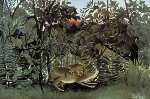 Rousseau adapted the poses of the two animals in the center of The Hungry Lion Throws Itself on the Antelope (1905) from the diorama seen here, which was made for the zoological galleries of the Jardin des Plantes. When Rousseau exhibited the painting at the 1905 Salon d'Automne, it was accompanied by the following caption: "The hungry lion throws itself upon the antelope, devours him; anxiously the panther awaits the moment that he too can claim his share. Birds of prey have torn a strip of flesh from the poor animal that is shedding a tear!"