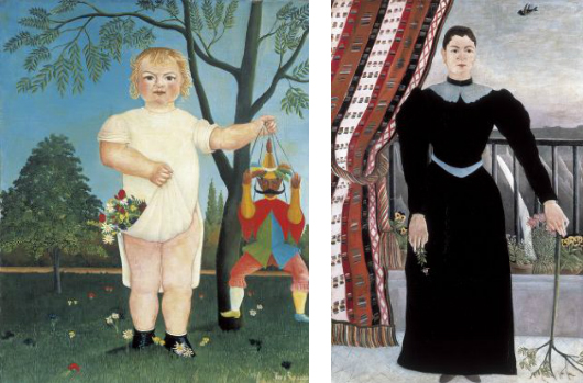 Rousseau's portraits represent some of his most disconcerting paintings. His depictions of children are especially unnerving: fiercely independent, with adult demeanors, they appear neither playful nor innocent. Rousseau also gave his sitters peculiar props, such as an oversized marionette or an upturned branch used as a cane. In traditional portraits such props are often symbolic, but here they resist explanation. This, along with puzzling settings and alienating expressions, lend the sitters an unfamiliar, mysterious air and make the established genre of portraiture seem strange as well.