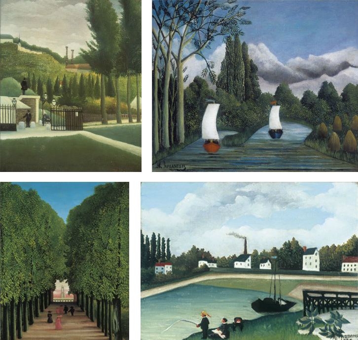 While Rousseau's suburban landscapes are punctuated with signs of modernity (smokestacks, telephone poles, factories), his views of Paris are devoid of the bewildering chaos of the modern metropolis. Instead the artist offers a tranquil vision of a capital where citizens stroll through parks, relax on boating excursions, and fish along riverbanks. The calm, cultivated views of suburban Paris provide a contrast to his emotionally charged images of exotic jungles. Yet the eerie stillness of these suburban landscapes and their odd leaps in scale make the familiar seem strange.
