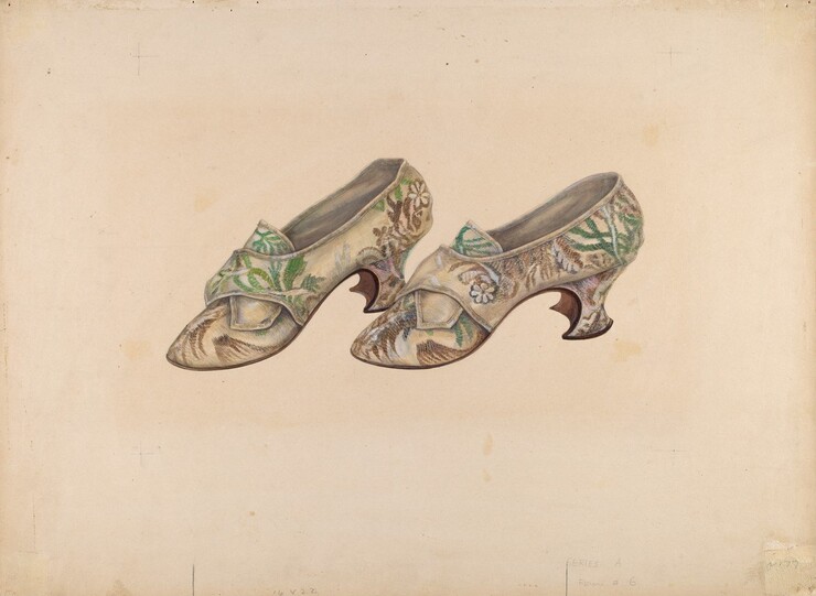Marie Alain (artist), American, active c. 1935, Anonymous Craftsman (object maker), Miss Ellen C. Pleasants (object owner), Woman's Shoes, c. 1939, watercolor, graphite, and gouache on paperboard, Index of American Design, 1943.8.1907