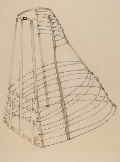 Oval-shaped hoops, called paniers, support this skirt. The word comes from the French, meaning "basket" or "hamper," since they resembled the baskets for provisions carried in pairs by horses or mules. Paniers were usually made of metal or whalebone. They were also known as paniers à coudes, the French word for elbow, because the wearer could rest her elbows on them.