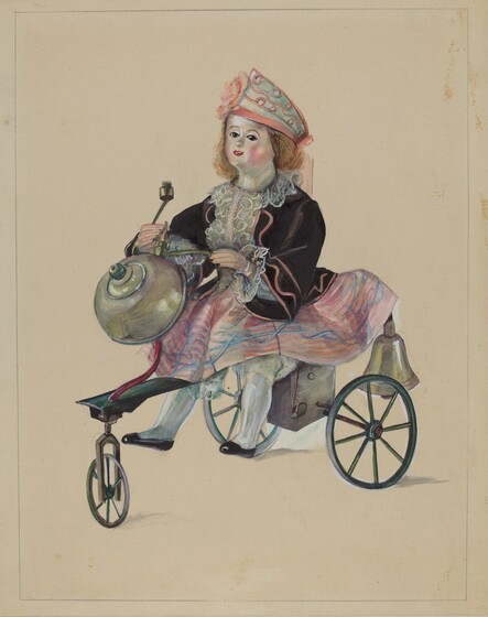 Mina Lowry (artist), American, 1894 - 1942, Anonymous Craftsman (object maker), Elie Nadelman (object owner), Doll on Velocipede, c. 1936, watercolor, graphite, and gouache on paper, Index of American Design, 1943.8.15439