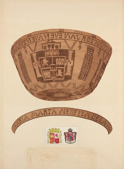 Baskets of the California Indians have been considered the finest of their type ever made. This one was made in 1822 at the Mission of Buenaventura. An inscription woven into the border reads: "Made by Anna Maria Marta, Neophyte of the Mission of the Serafic Doctor, Saint Bonaventura." The central panel shows the coat of arms of Spain: a crown above the castles of Castile and the lions of Leon. The representation of the coat of arms is so simplified that it is barely recognizable, partly because the technique of weaving tends to give a geometric character to any design. The basket is made in the usual Indian fashion: coils of a tall, thin grass were covered with rush and sewn together.