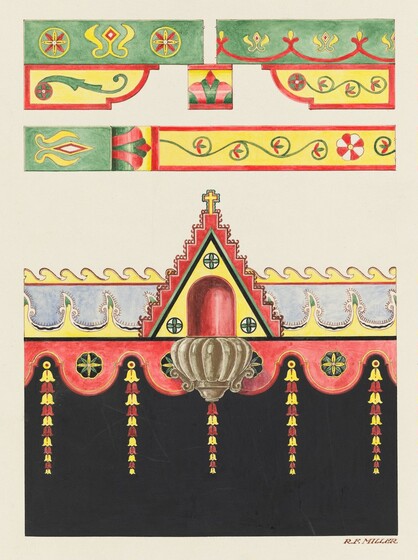 Randolph F. Miller (artist), American, active c. 1935, Anonymous Craftsman (Native American) (object maker), Wall and Ceiling Decorations, and Holy Water Font; Restoration Drawing, 1936, watercolor, colored pencil, pen and ink, gold ink,and graphite on paper, Index of American Design, 1943.8.5998