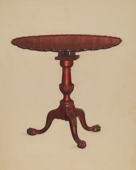 As the colonists' standard of living became more luxurious, specialized furniture forms were developed. The habit of drinking tea became popular in the 1730s, and tea tables became an important eighteenth-century furniture form after 1740. During the Chippendale period, cabinetmakers developed a tripod base tea table with its top supported by a birdcage device of the kind that appears here. The "birdcage" apparatus was ornamental as well as functional; it permitted the top to revolve when the table was in use for serving, but a peg inserted through the center prevented the top from spinning wildly. This characteristic Chippendale tea table stands on three boldly outthrust cabriole legs carved at the knee and ending with the usual ball and claw foot. The top is scalloped and edged with molding cut from the solid wood; the molded edge gave rise to the term "piecrust table," frequently used in reference to tables such as this one.