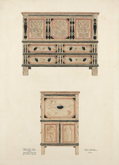 Harold Merriam (artist), American, 1910 - 2002, Anonymous Craftsman (object maker), Yale University (object owner), Tulip and Sunflower Chest, 1936, watercolor, pen and ink, and graphite on paper, Index of American Design, 1943.8.7681