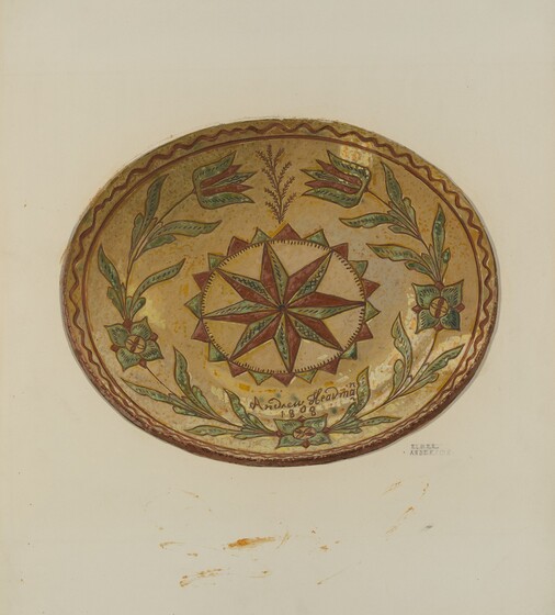 Eugene Shellady (artist), American, active c. 1935, John Leidy (object maker), Pennsylvania Museum, Memorial Hall (object owner), Pennsylvania German Dish, c. 1938, oil paint on paperboard, Index of American Design, 1943.8.8020