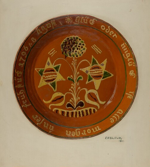 Elmer G. Anderson (artist), American, active c. 1935, Anonymous Craftsman (object maker), Mercer Museum of Bucks County Historical Society (object owner), Pennsylvania German Pie Plate, 1935/1942, watercolor, gouache, and graphite on paperboard, Index of American Design, 1943.8.3418