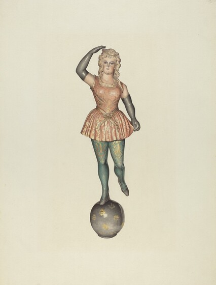 This ballet girl, a rather plump blonde with luxuriantly disheveled hair, was an ornament for the calliope, or steam organ. Carved around 1895, it is typical of the figures of dancers and musicians favored as suitable subjects for calliopes.