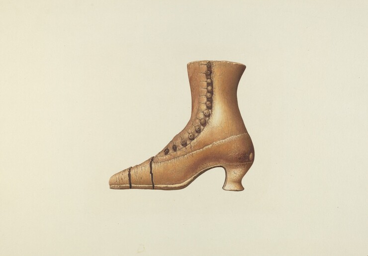 Not all shop signs were human figures. Many, like this shoe, simply exhibited a sample of the goods for sale within. This is a more direct method of advertising. This carving of a shoe is a fine piece of craftsmanship, with graceful lines and precise details. The grain and character of the wood are shown to good advantage.
