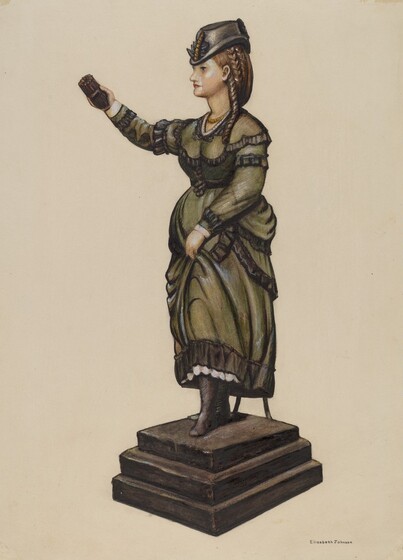 Shop figures and trade signs are a form of American folk art that is still in use today for ornamental purposes. The first shop signs, however, were not only decorative, they were a practical aid to those potential customers that could not read. In addition, signs pinpointed the location of a shop before the days of house numbers. Early American streets presented a lively picture of activities with signs such as barber poles, wooden Indians, gloves, clocks, boots, and spectacles calling attention to services or goods offered for sale. Some carvers of shop figures and signs were drawn from among the makers of ship decorations. The shift in emphasis was increasingly felt in the late nineteenth century, when figurehead carvers were being forced out of business with the demise of the clipper ship era. These craftsmen gradually turned to the full-time production of wooden Indians and other signs. The Indian, as the first American to cultivate tobacco, became the traditional symbol for cigar stores. The production of wooden Indians flourished from about 1840 to the end of the century. In the 1890s, city ordinances required that figures be confined to the interiors of shops, and gradually the statues went out of use. This woman, or Pocahontas, as female Indian figures were sometimes called, was made by a particularly capable artisan. The pose of the statue reflects classical or Egyptian inspiration. The figure is elegantly fashioned; the stance seems natural, the costume has been simplified, and the colors are harmonious.
