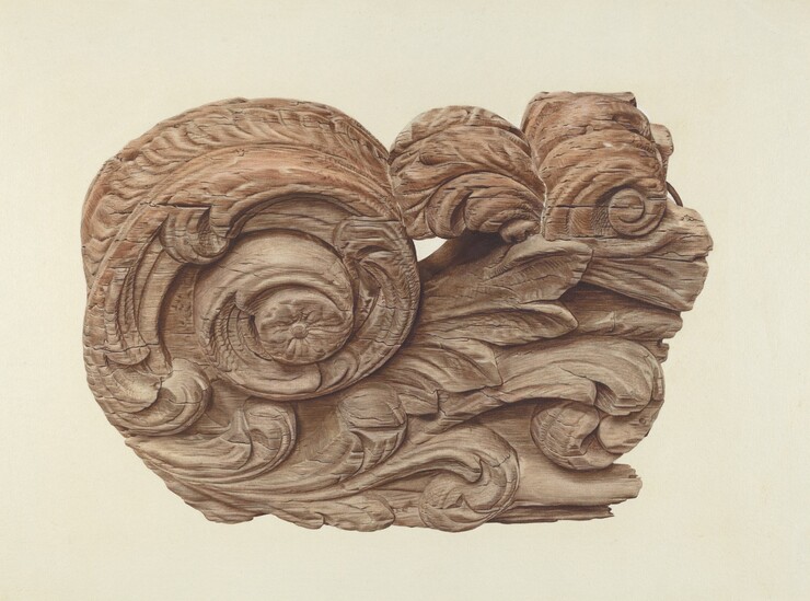 Hazel Hyde (artist), American, active c. 1935, Anonymous Craftsman (object maker), Peabody Essex Museum (object owner), Billethead from Ship "Favorite", c. 1938, watercolor, colored pencil, and graphite on paperboard, Index of American Design, 1943.8.8077