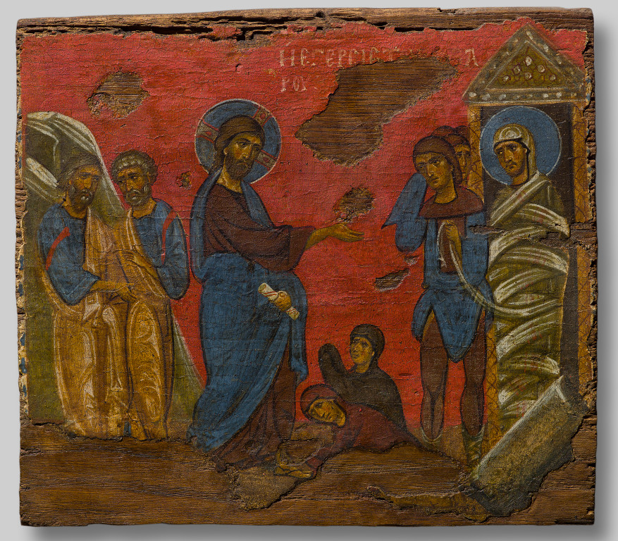 The subject is one of Christ’s miracles: the raising of Lazarus from the dead. His two sisters kneel at Christ’s feet, while the apostles Andrew and Peter witness the resurrection. Lazarus stands at the entrance to his tomb, still in his burial shroud, which a youth is beginning to unwind. Instead of the usual gold background, the artist used less expensive red pigment for the sky, another way to situate the event in a timeless, otherworldly realm.