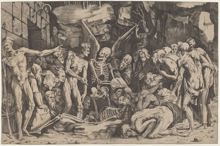 Marco Dente, The Skeletons, after Baccio Bandinelli, c. 1518, engraving, Ailsa Mellon Bruce Fund, 2012.56.2