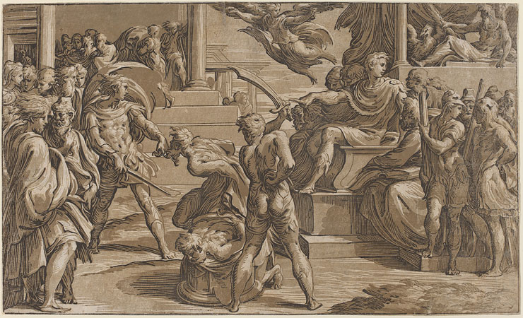 Antonio da Trento, The Martyrdom of Saint Peter and Saint Paul, after Parmigianino, c. 1530, chiaroscuro woodcut printed from three blocks in ochre and black, Gift of Ruth Cole Kainen, 2006.162.2
